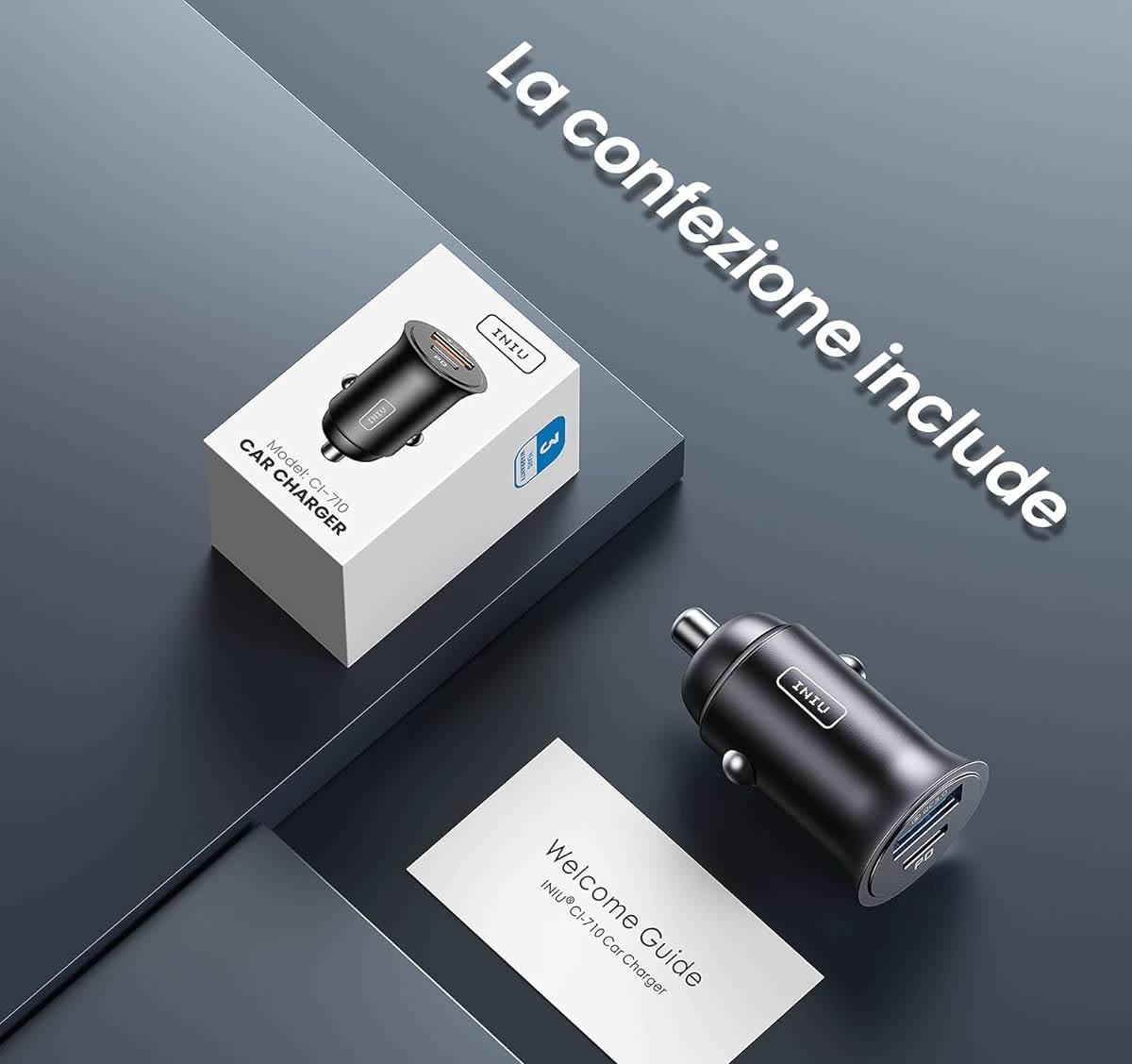 Titolo: Caricatore USB per Auto con 2 Porte (USB Type-C e USB A 3.0) con ricarica veloce, per presa accendisigari, compatibile con iPhone, Samsung, Huawei, tablet - colore Nero