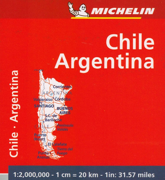 Mappa stradale del Cile e Argentina, aggiornata e molto dettagliata con distanze stradali, indice delle località, mappe del centro città di Santiago e Buenos Aires.