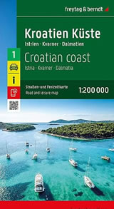 Mappa stradale della costa della Croazia con cartografia aggiornata e molto dettagliata, con una ricca simbologia stradale, con strade numerate, aeroporti, ferrovie, distanze stradali, luoghi panoramici, parchi naturali e l'indice digitale di tutte le località.