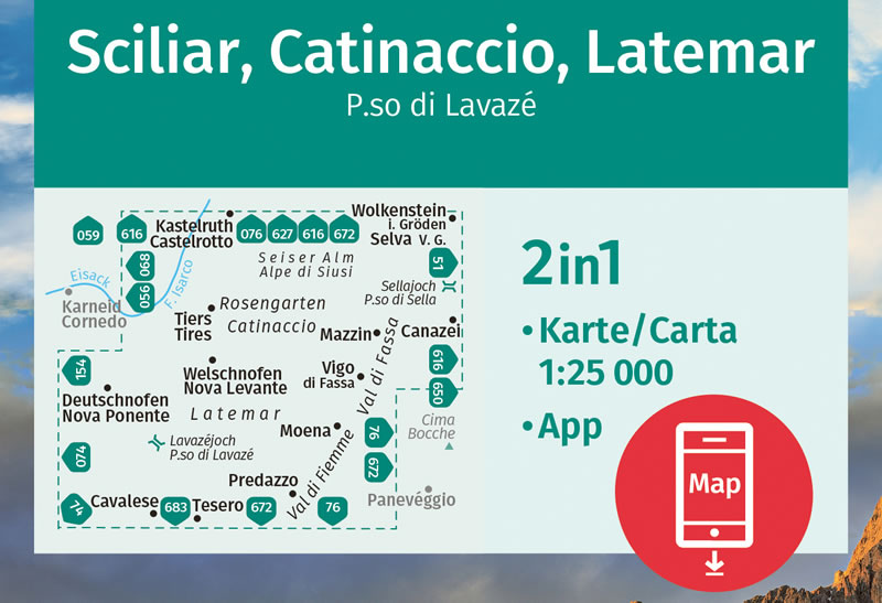 Sciliar, Catinaccio, Latemar, Passo di Lavazé - con Predazzo, Val di Fiemme, Val di Fassa, Moena, Nova Levante, Nova Ponente, Tires, Canazei, Vigo di Fassa, Passo di Sella, Alpe di Siusi, Castelrotto, Selva - mappa escursionistica Kompass n.651 - plastificata - compatibile con GPS - nuova edizione
