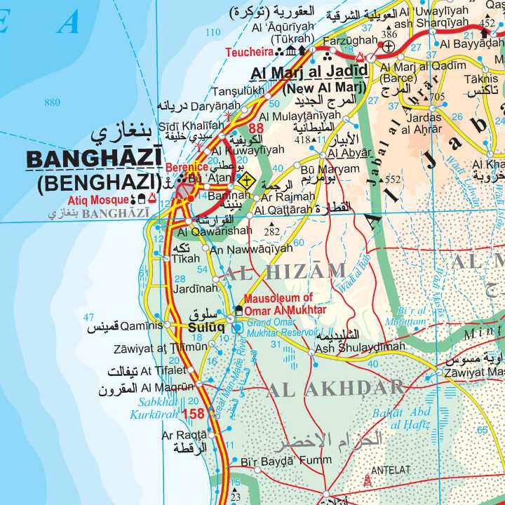 Immagine per mappa stradale Libia / Libya - mappa stradale - con Tripoli, Bengasi, Misurata, Tobruch, Sebha, Bani Walid, Zawiya, Agedabia, Sirte, Beida, al-Marj, Derna - EDIZIONE 2025