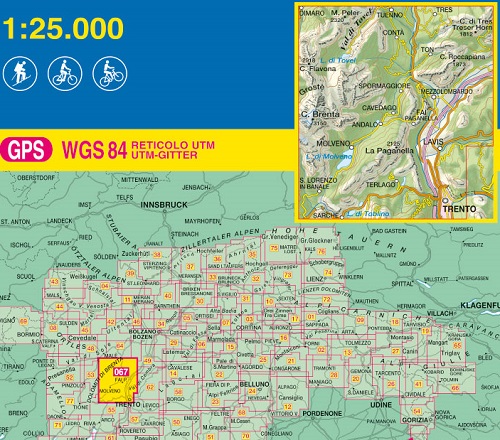mappa topografica n.067 - Altopiano della Paganella, Val di Tovel, Flavona, C. Brenta, Trento - Spormaggiore, Cavedago, Mezzolombardo, Ton, C. Roccapiana, Fai, Andalo, Molveno, Lavis, Terlago, Lago di Tovel - con reticolo UTM compatibile con sistemi GPS - edizione 2019