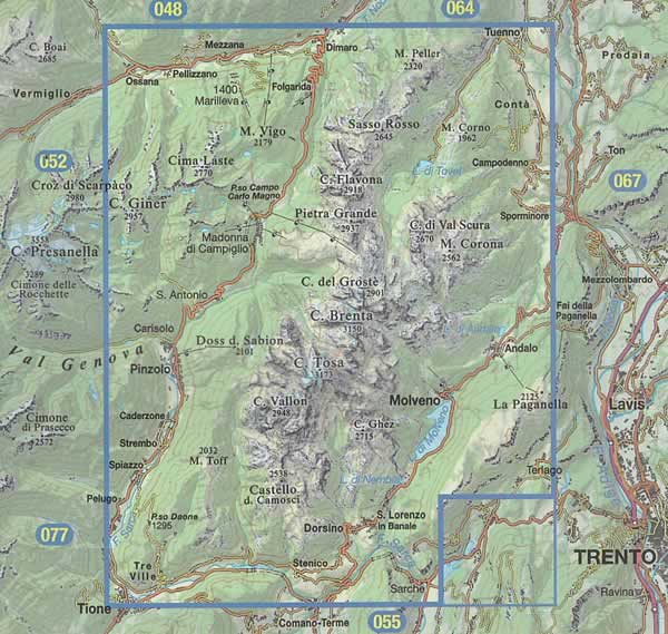 immagine di mappa topografica mappa topografica n.053 - Dolomiti di Brenta - con Pinzolo, Val Nambrone, Madonna di Campiglio, Dimaro, Lago di Tovel, Andalo, Molveno, S.Lorenzo in Banale - con reticolo UTM per GPS - impermeabile, antistrappo, plastic-free, eco-friendly - EDIZIONE 2025