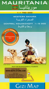 Mappa stradale della Mauritania molto dettagliata ed aggiornata con i dintorni di Noaukchott, Nouadhibou, Rosso/Rusu, Kaedi, Zouérat, Kiffa, Atar, Sélibabi, Néma, Tijikja, Aleg, Ayoun el-Atrouss, Akjoujt, Sahara orientale, Dagana (Senegal), Saint Louis (Senegal) e Dakar (Senegal); con mappa del centro città di Noaukchott e l'indice di tutte le località.