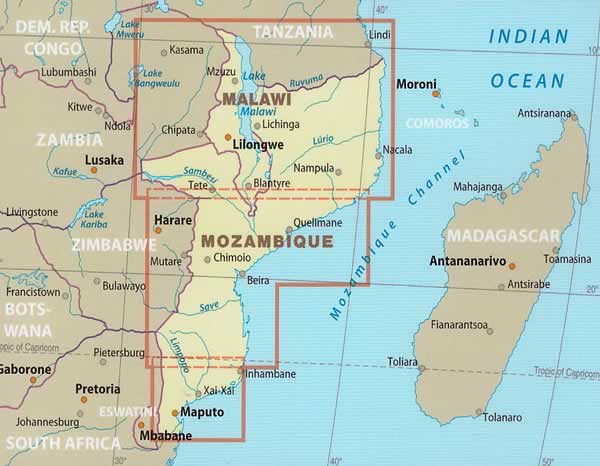 Titolo: Mozambico, Malawi - con Maputo, Lilongwe, Beira, Quelimane, Nampula, Lindi, Tunduru, Harare - mappa impermeabile e antistrappo