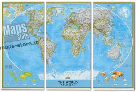 Carta del Mondo Politica, molto dettagliata e con eleganti rifiniture. Il Planisfero si compone di 3 fogli in carta di grandi dimensioni (simili alla carta da parati), con informazioni sulla densità demografica, clima, fusi orari, sezioni dei poli, fondali oceanici, correnti marine e confini degli Stati evidenziati con colori diversi. Una grande carta del Mondo ottima per l'arredamento sia per la casa che per l'ufficio. Modalità di montaggio: è possibile applicarla direttamente alla parete come la carta da parati oppure incorniciata da personale specializzato. I nomi dei Paesi sono riportati in inglese ed in lingua originale.